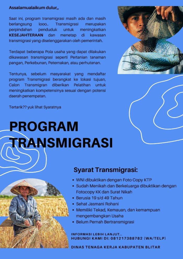Program transmigrasi masih terselenggara dan tersedia untuk masyarakat Kabupaten Blitar. Masyarakat yang berminat, dapat menghubungi atau mendatangi Dinas Tenaga Kerja Kabupaten Blitar dengan membawa persyaratan yang telah tercantum diatas. Beberapa lokasi yang menjadi daerah tujuan transmigrasi di Kabupaten Blitar adalah lokasi Di Pulau Sulawesi, seperti di Sulawesi Tengggara, Sulawesi Barat, Sulawesi ttengah dan beberapa provinsi lainnya. Beberapa transmigran sudah berhasil mengembangkan usaha budidaya tanaman di lokasi penmepatan transmigrasinya.