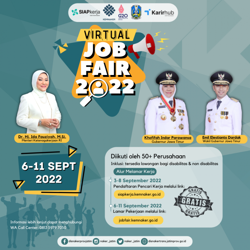 Halo Rekan Naker, bagi kalian yang belum sempat menghadiri event Job Fair di Surabaya, bisa mendaftar secara virtual melalui website kemnaker. Event ini diikuti oleh 50 Perusahaan di Jawa Timur dengan lebih dari 5000 kebutuhan tenaga kerja yang tersedia lowongan kerja dalam negeri dan lowongan kerja luar negeri. Tersedia juga lowongan untuk disabilitas. Segera kirimkan resume Rekan Naker melalui https://jobfair.kemnaker.go.id/